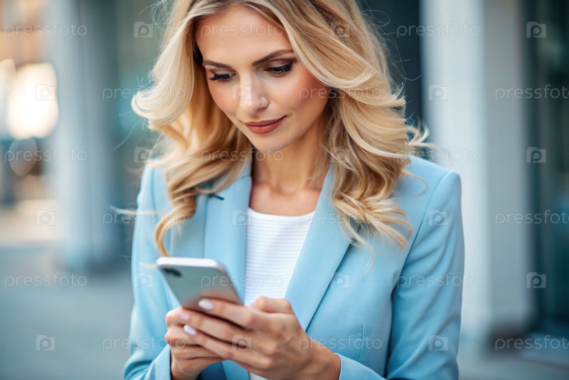 Блондинка-бизнесменка с кудрявыми волосами, она одета в обычное голубое пиджак. В руках у нее смартфон. Бизнесмен смотрит на свой мобильный телефон