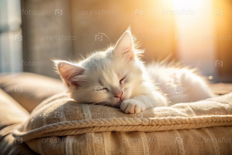 Милый чистый белый пушистый котенок спит на подушке у окна.Кошка удобно расположилась в своем любимом месте, чтобы отдохнуть под солнцем