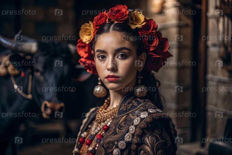 Испанская девушка в традиционном испанском национальном костюме. Перед быком. Бикоборство. Портрет символизирует традиции и культуру народа Испании