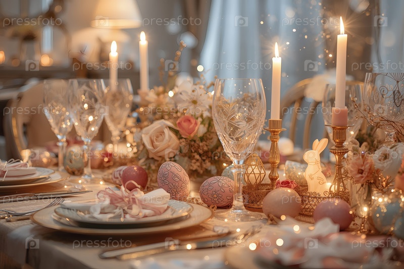 Пасхальный баннер 2026. декоративная тарелка, столовая посуда, стаканы, пасхальные яйца и кролики. концепция празднования Пасхи для кафе и ресторанов