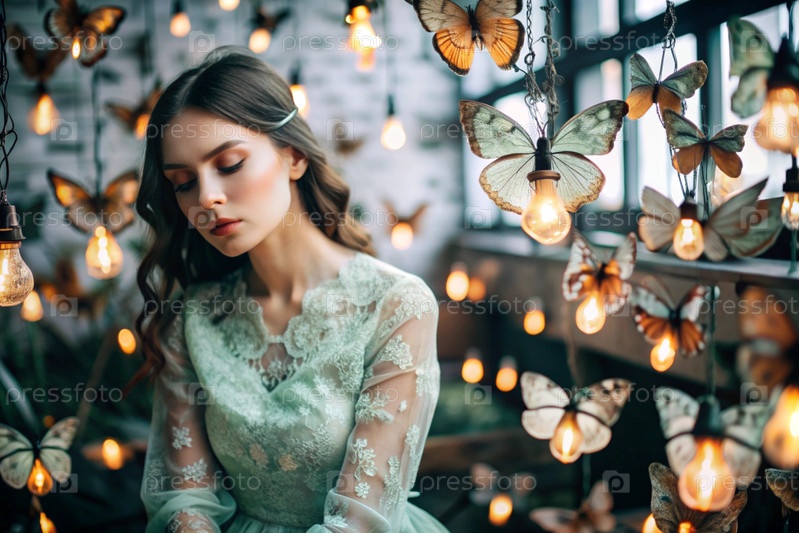 Портрет красивой девушки в зеленом платье среди многих подвешенных лампочек и бабочек, размахивающих вокруг нее