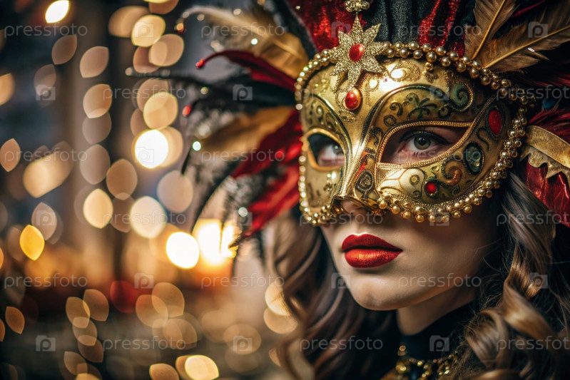 Карнавал Венеции.Закрытие женщины в украшенной карнавальной маске.Яркие цвета передают атмосферу празднования и роскоши