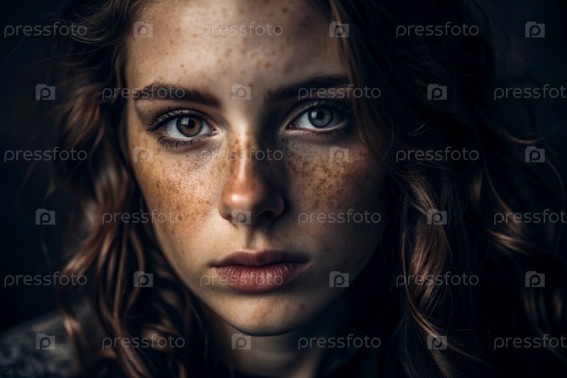Глубокий эмоциональный портрет. Лицо молодой девушки без макияжа с выразительными глазами и кудрявыми коричневыми волосами. Естественная женская красота
