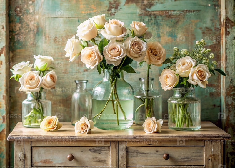 Красивый чай, кремовые розы в стеклянных вазах и бутылках на древнем деревянном шкафу. Букет цветов в вазе в интерьере дома. Светлый, бежевый, зеленый цветочный фон
