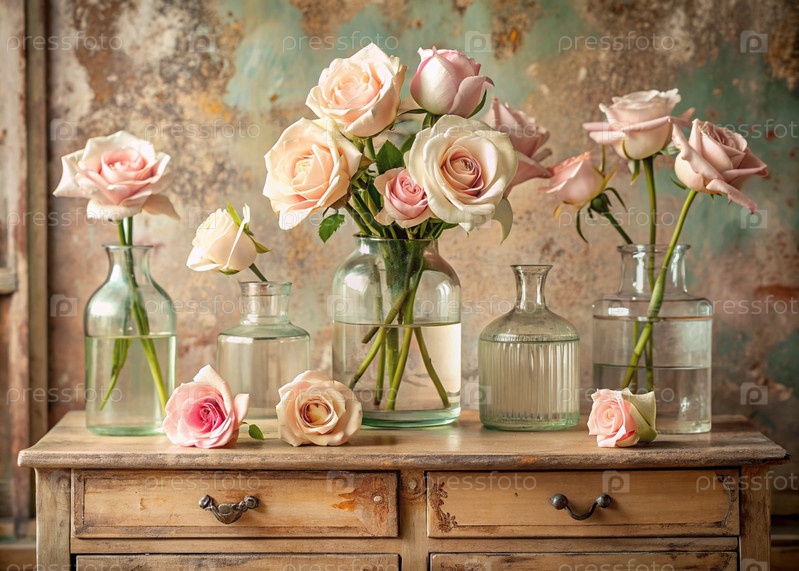Красивые розы в стеклянных вазах и флаконах на древнем деревянном шкафчике Букет цветов в вазе в интерьере дома Светлый, бежевый, розовый цветочный фон