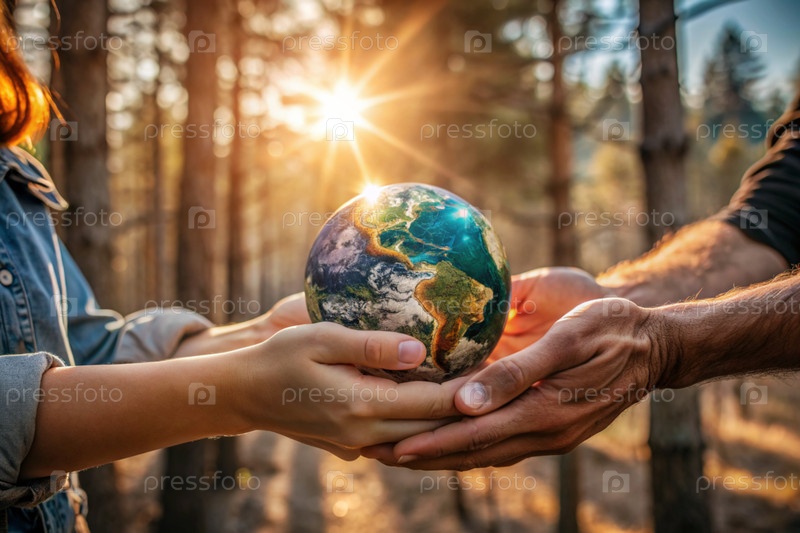Мужчины и женщины держат маленькую модель Земли. Возрождение. Забота о планете, экологическое сознание и единство людей в сохранении природы