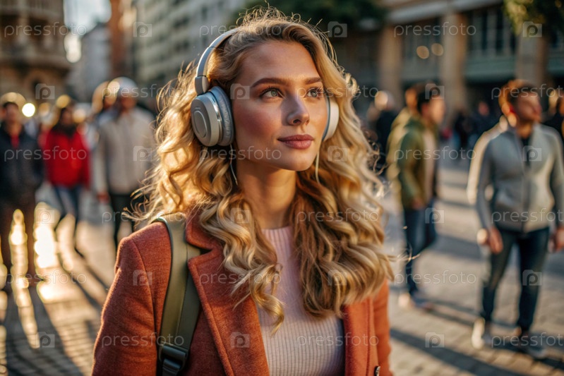 Музыкальный любитель. молодая красивая кудрявая женщина с рюкзаком на фоне улицы и людей. Турист слушает музыку в наушниках и гуляет по городу