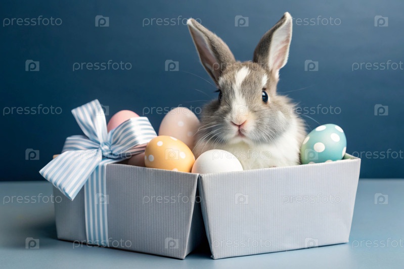 Известный праздник. милый пасхальный кролик заглядывает из коробки с подарками и разноцветные яйца разбросаны вокруг. концепция счастливой Пасхи