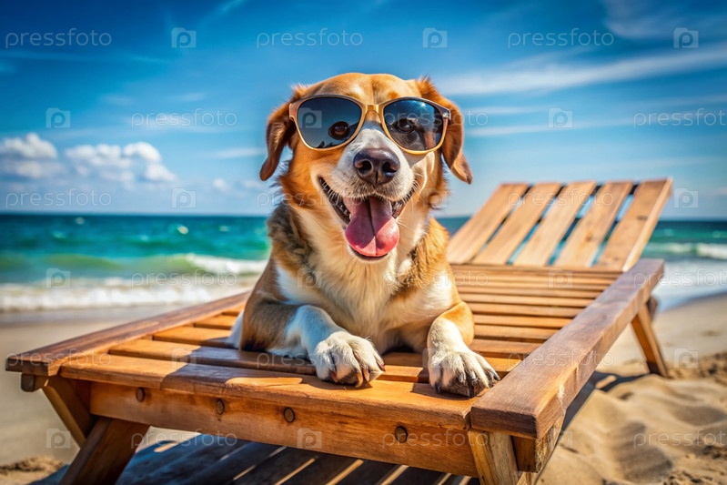 Счастливая собака на пляже в солнцезащитных очках лежит на деревянном шезлонге. концепция курортного отдыха с домашними животными
