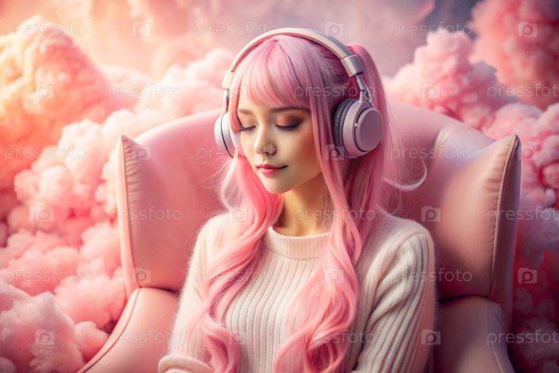 Молодая красивая японская девушка с розовыми волосами в аниме слушает музыку на беспроводных наушниках в розовых облаках