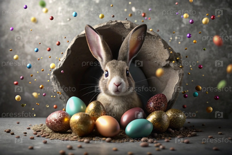 Известный праздник. милый пасхальный кролик заглядывает из ямы с красочными яйцами вокруг. концепция счастливой Пасхи
