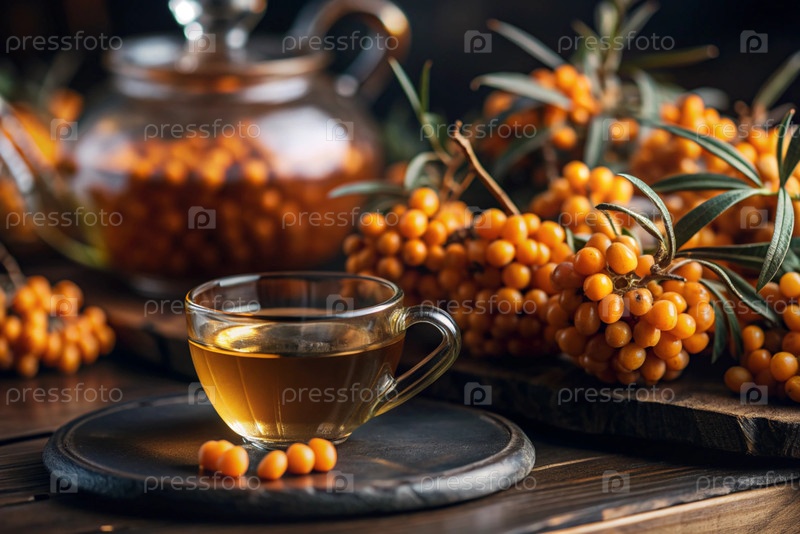 Здоровая, спелая ягода морского гречневого терна в ближайшем плане.Витамин, оранжевый, осенний, сезонный чай из ягод морского гречневого терна на темном фоне.Яблочный чай для иммунной системы