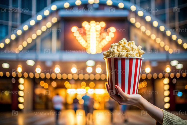 Красно-белый полосатый ящик с солеными попкорнами в руке на фоне светофоров кинотеатра
