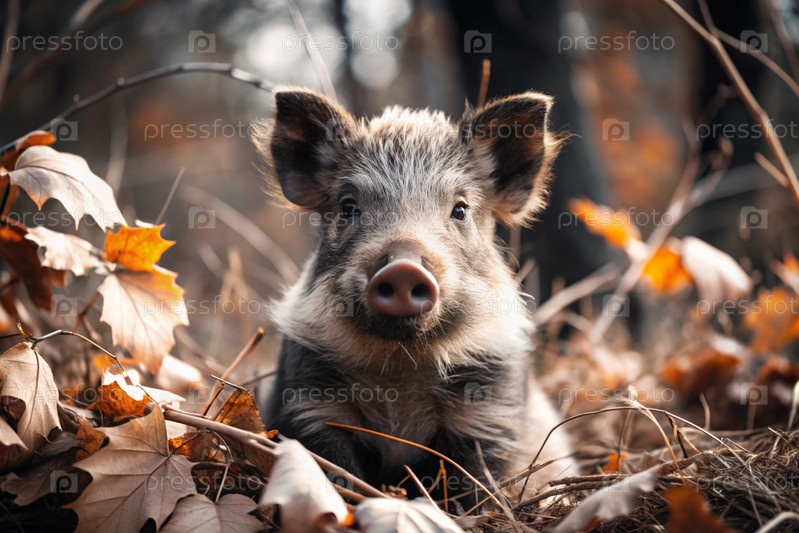 Красивый кабан, сидящий среди осеннего желтого листья.Охота на животных