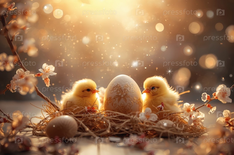 Концепция яркого Пасхального праздника. Нежные розовые пасхальные яйца, желтые курицы и вишневые ветви на деревянном фоне. Концепция ярких пасхальных праздников в 2026 году