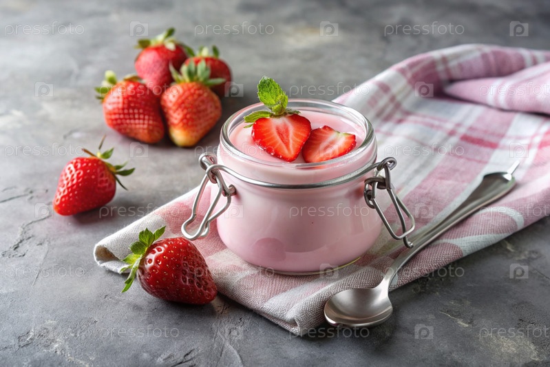 Домашний клубничный йогурт со свежими ягодами, винтажной ложкой и полотенцем на стильном сером фоне