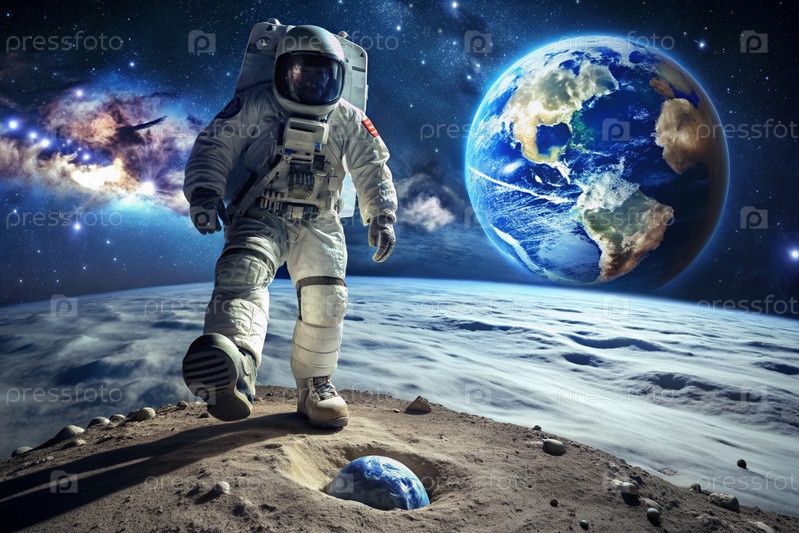 Счастливый День космоса.Астронавты в скафандре на Луне в космическом пространстве.Впечатляющий вид на планету Земля