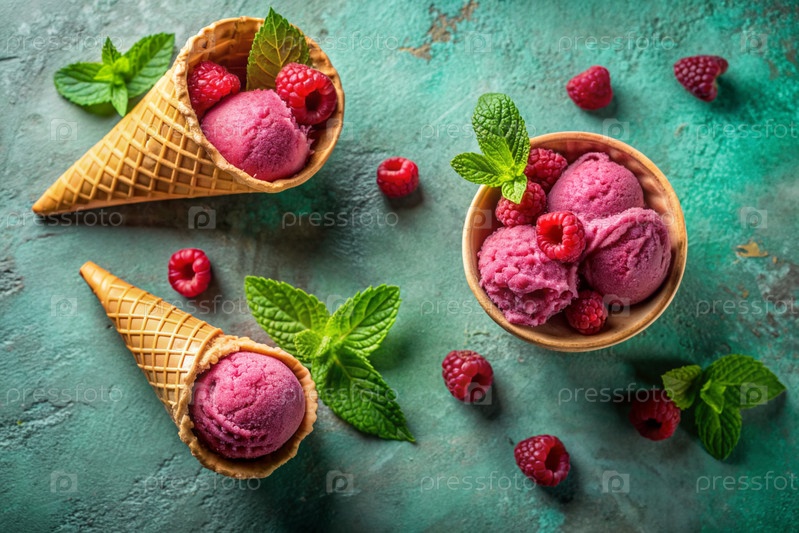Сладкий десерт. Стильная современная концепция. Розовое малиновое мороженое на ярко-турецком фоне. Всемирный день мороженого
