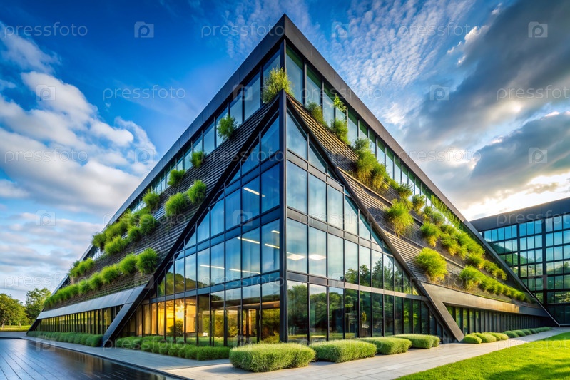 Современная городская экология. Снижение выбросов углекислого газа в городе. Экологически чистое стильное здание с посаженными зелеными растениями для нормализации содержания кислорода в воздухе
