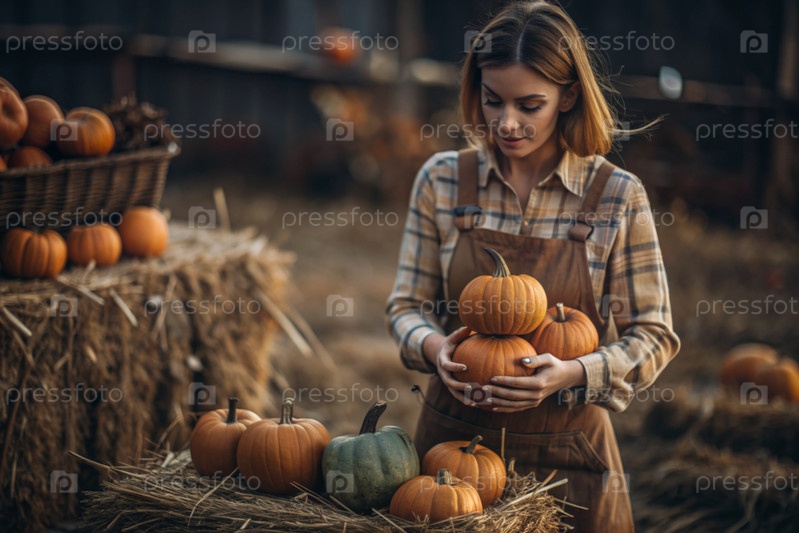 Руки женщины в квадратной рубашке с тыквенным крупным планом и красивым осенним рисунком. Сбор тыков. Концепция празднования Дня благодарения и Хэллоуина