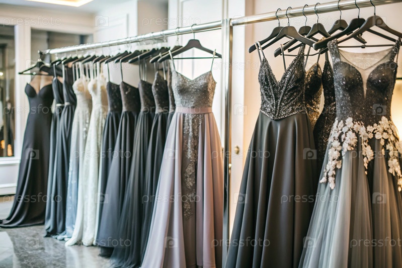 Элегантные женские платья висят с белых вешалок на штанге в салоне