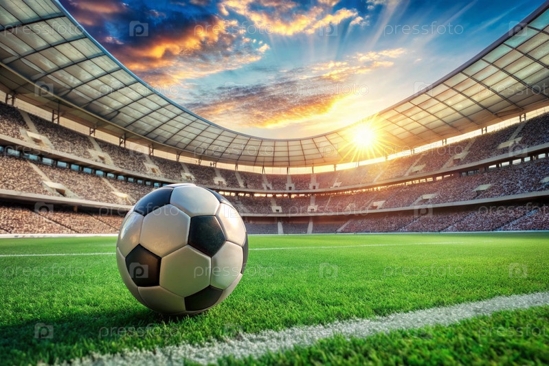 Футбольный мяч на зеленом поле футбольного стадиона, готовый играть в центре поля