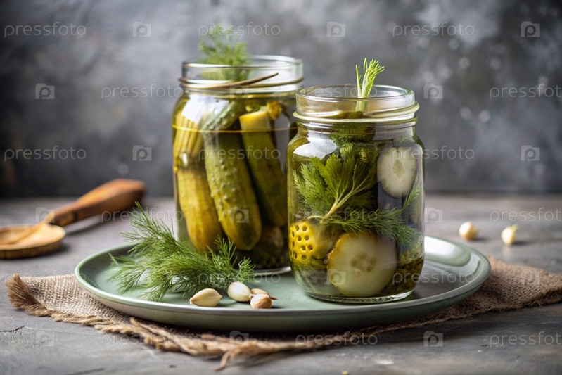 Хрустящие огурцы в прозрачной стеклянной банке на столе, покрытые льняным скатертьем. цельнозеленые маленькие огурчики с укропом и чесноком. вкусные овощи из консервов. мы закрываем огурцы для зимы