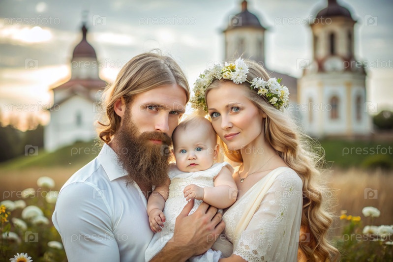 Всероссийский день семьи, любви, верности мужчина и женщина с ромашками с ребенком в руках на фоне православной церкви День святого Валентина Петра и Февронии