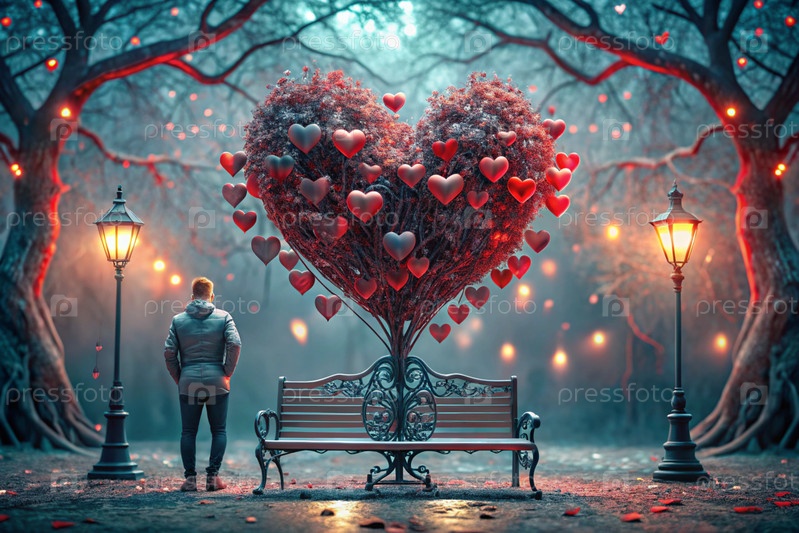 Красивое фантастическое дерево в форме сердца, сияющее среди деревьев парка и скамейка для влюбленных на сказочном фоне боке-стиля