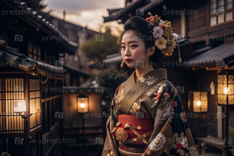 Японская девушка в традиционном национальном костюме - кимоно. На фоне домов, фонарей и вишневых деревьев портрет символизирует традиции и культуру народа Японии