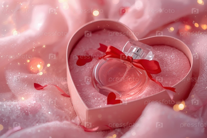 Элегантная бутылка женского парфюма в мягкой розовой подарочной коробке, украшенной красной лентой и сердцами