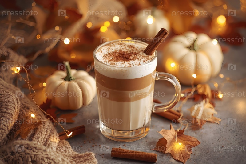 Вкусное тыквенное латте в стеклянной кружке, тыквы и осенние листья на деревянном столе. Сезонные напитки. вкусный горячий капучино или латте. Осенний баннер