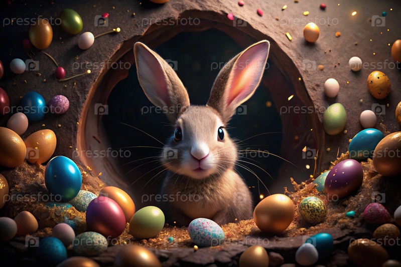 Известный праздник. милый пасхальный кролик заглядывает из ямы с красочными яйцами вокруг. концепция счастливой Пасхи