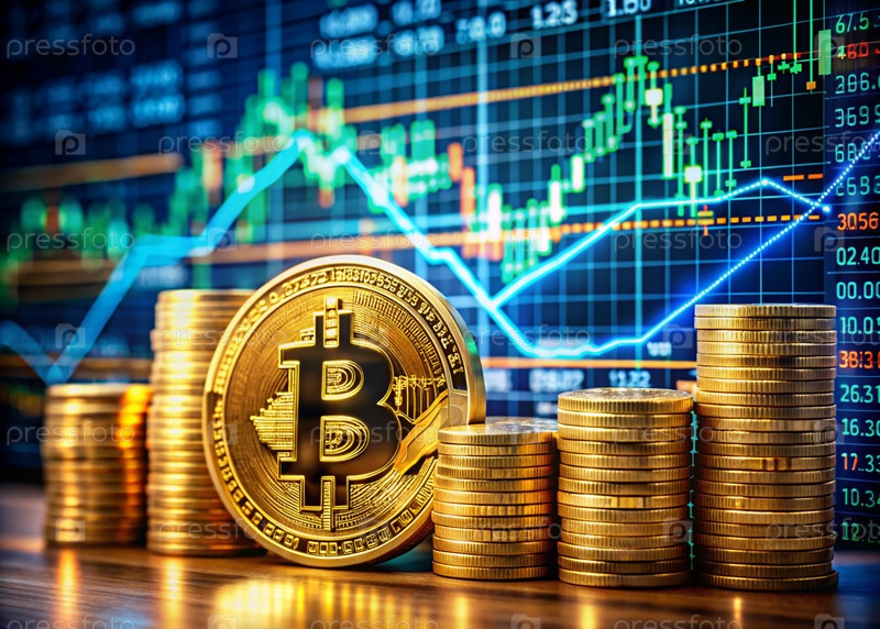 Золотые монеты - это биткойны с обменным курсом на виртуальном экране.Изображение создано с использованием искусственного интеллекта