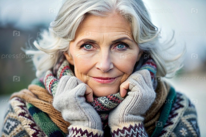 Осенний портрет красивой пожилой женщины, пенсионерки 70 лет. Она носит шарф с этническим узором и теплый свитер. Концепция жизни пожилых людей
