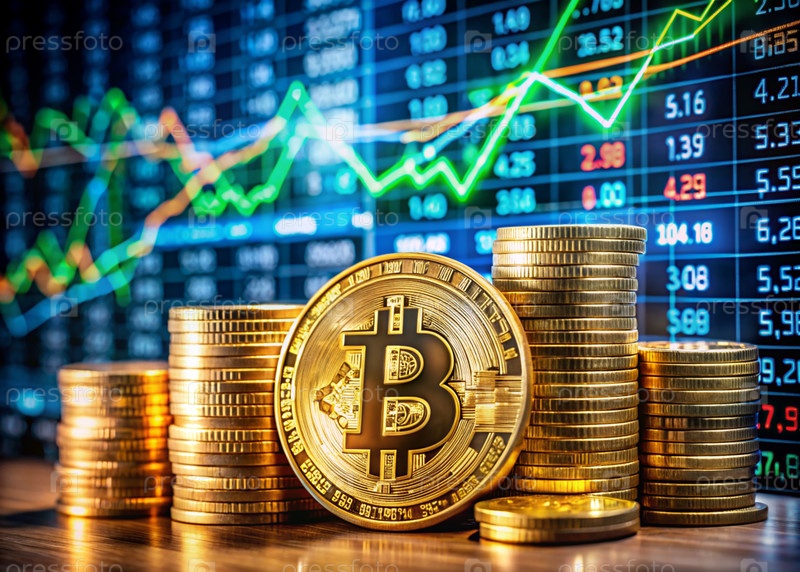 Золотые монеты - это биткойны с обменным курсом на виртуальном экране.Изображение создано с использованием искусственного интеллекта