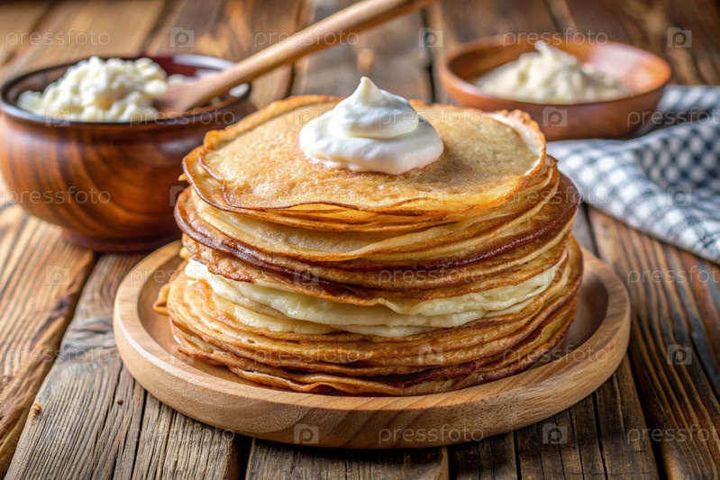 Вкусные блины с кислой смесью.Блины упаковываются в большую кучу.Концепция русского праздника Масленицы