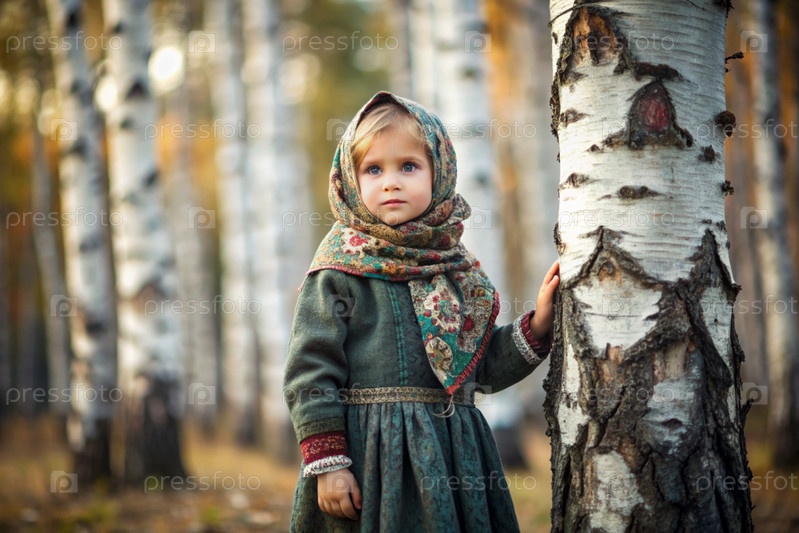 Русские народные традиции.Русский аромат.Красивая девочка в национальном русском платье и шарфе в красивом березовом роще.Портрет прекрасной девушки в березном лесу