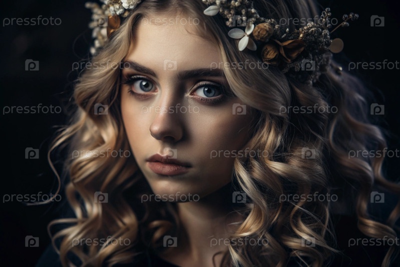 Глубокий эмоциональный портрет.Лицо молодой девушки без макияжа с выразительными глазами и блондинскими кудрявыми волосами.Естественная женская красота