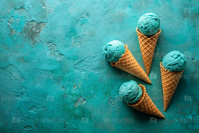 Сладкий десерт. Стильная современная концепция. Бирюзовый конус мороженого на бирюзовом фоне. Всемирный день мороженого