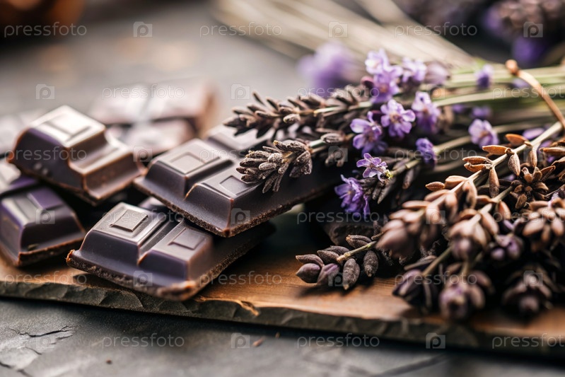 Кусочки шоколада с веточками лаванды для десерта на деревянном фоне