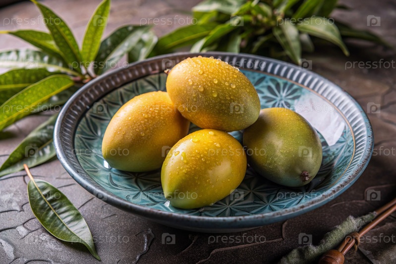 Свежие манго. Вкусные ягоды и фрукты ярко-желтого цвета с капельками воды. Вегетарианство. Здоровое питание. Свежий плод на столе