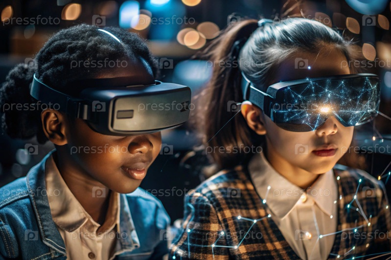 Чернокожая африканская девушка с очками виртуальной реальности.Ребенок находится в классе, а другие ученики на заднем плане.Цифровой интерфейс отображается в наушниках