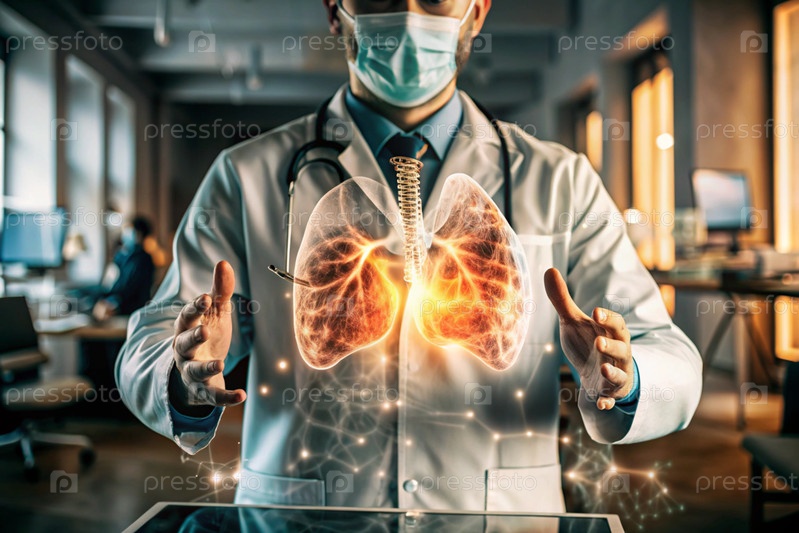 Врач в белом пальто демонстрирует голографическую модель человеческого легкого.Развитие медицинских технологий с использованием искусственного интеллекта