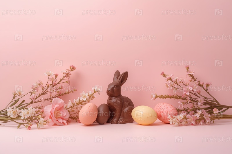 Счастливая Пасха 2026, минималистическое студийное фото. Шоколадный пасхальный кролик, пасхальные яйца и нежные весенние цветы. Мягкое освещение студии создает ощущение чистоты и воздушности