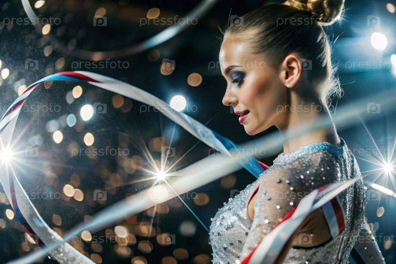 Ритмическая гимнастика - это крупный план красивой гимнастки с лентой в центре внимания на спортивной арене