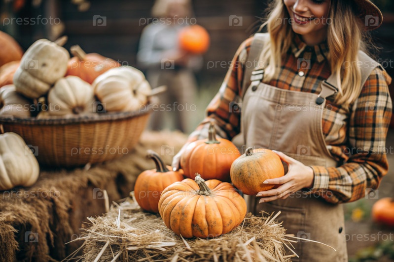Руки женщины в квадратной рубашке с тыквенным крупным планом и красивым осенним рисунком. Сбор тыков. Концепция празднования Дня благодарения и Хэллоуина