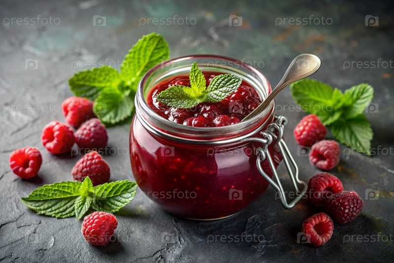 Банка домашней малины, здоровый варенье с мятой на черном фоне.Сохранение и уборка летом