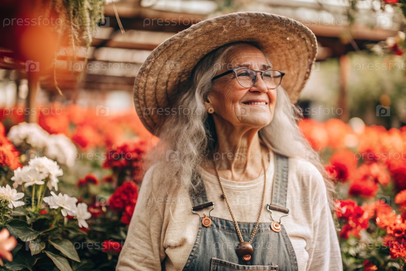 Пожилой садовник с седыми волосами в комбинезоне в уютной цветочной теплице