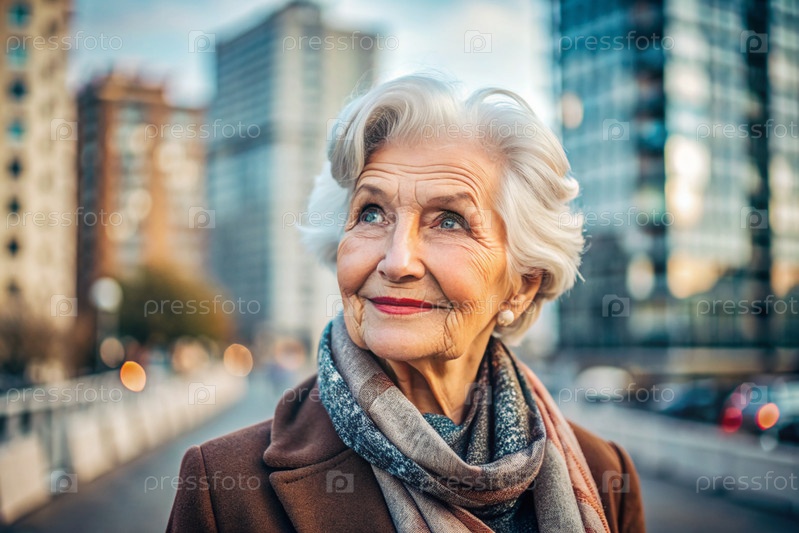 Портрет стильной, модной пожилой женщины, 70-летнего пенсионера на улице с очками и одеждой в спокойных бежевых тонах